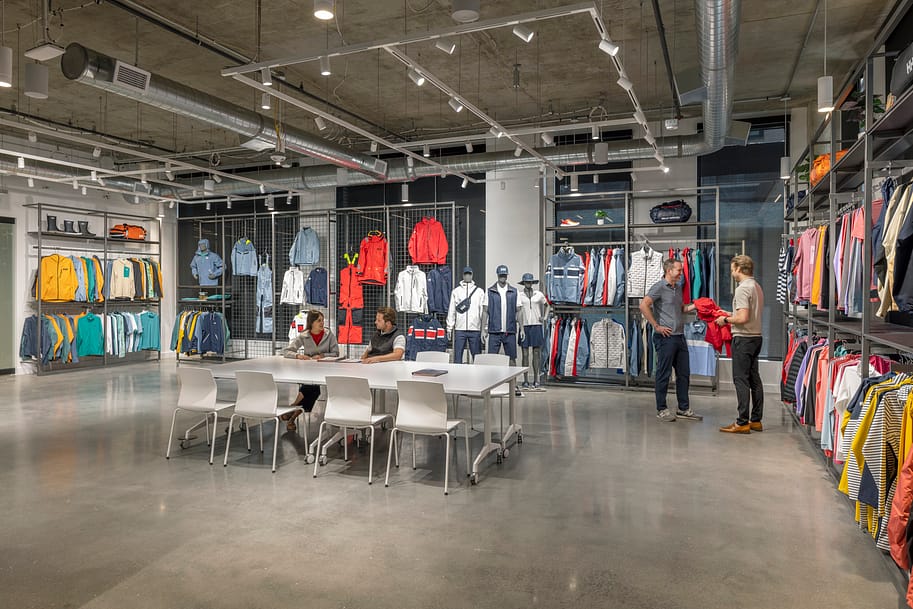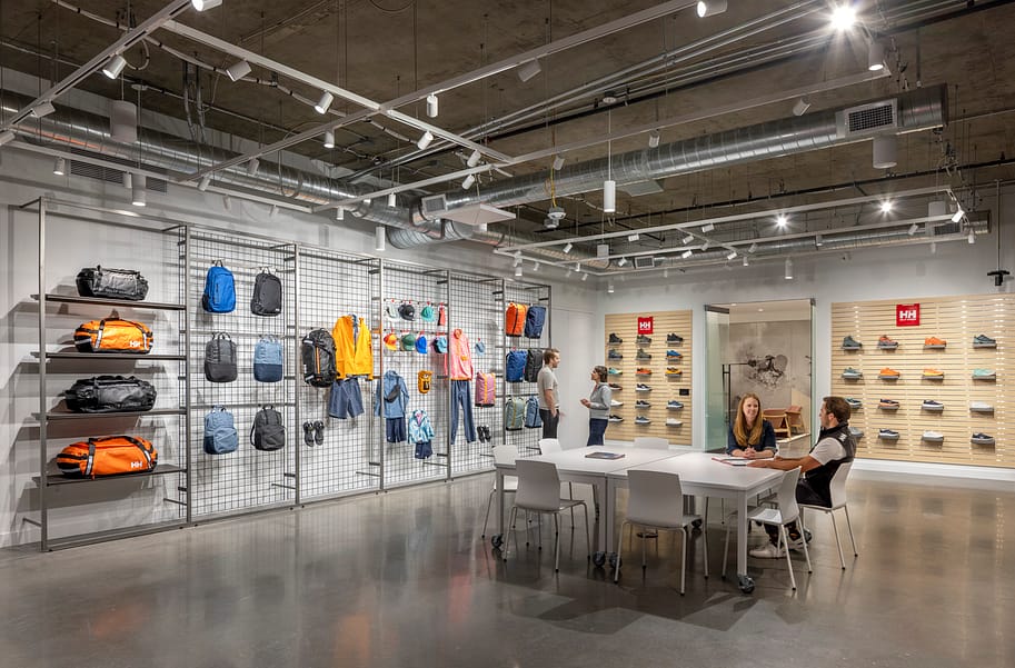 Helly Hansen envisioned an energetic, minimalist design in sync with its youthful, active workforce and products. The design draws on the Scandinavian principles of minimalism, functionality, and authentic materiality, with an injection of the brand’s signature color red.