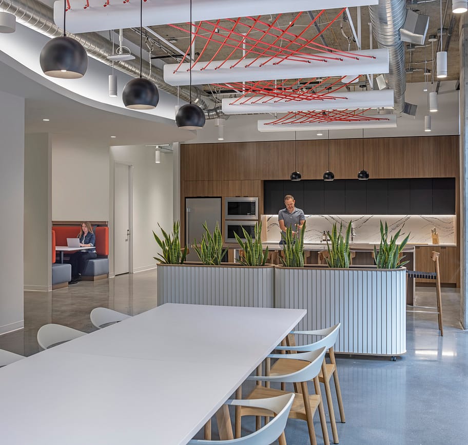 Also, open and closed collaboration spaces offer the team a variety of ways to work together. A lounge, designed as a venue for company-wide traditions, reinforces the company culture and encourages belonging.